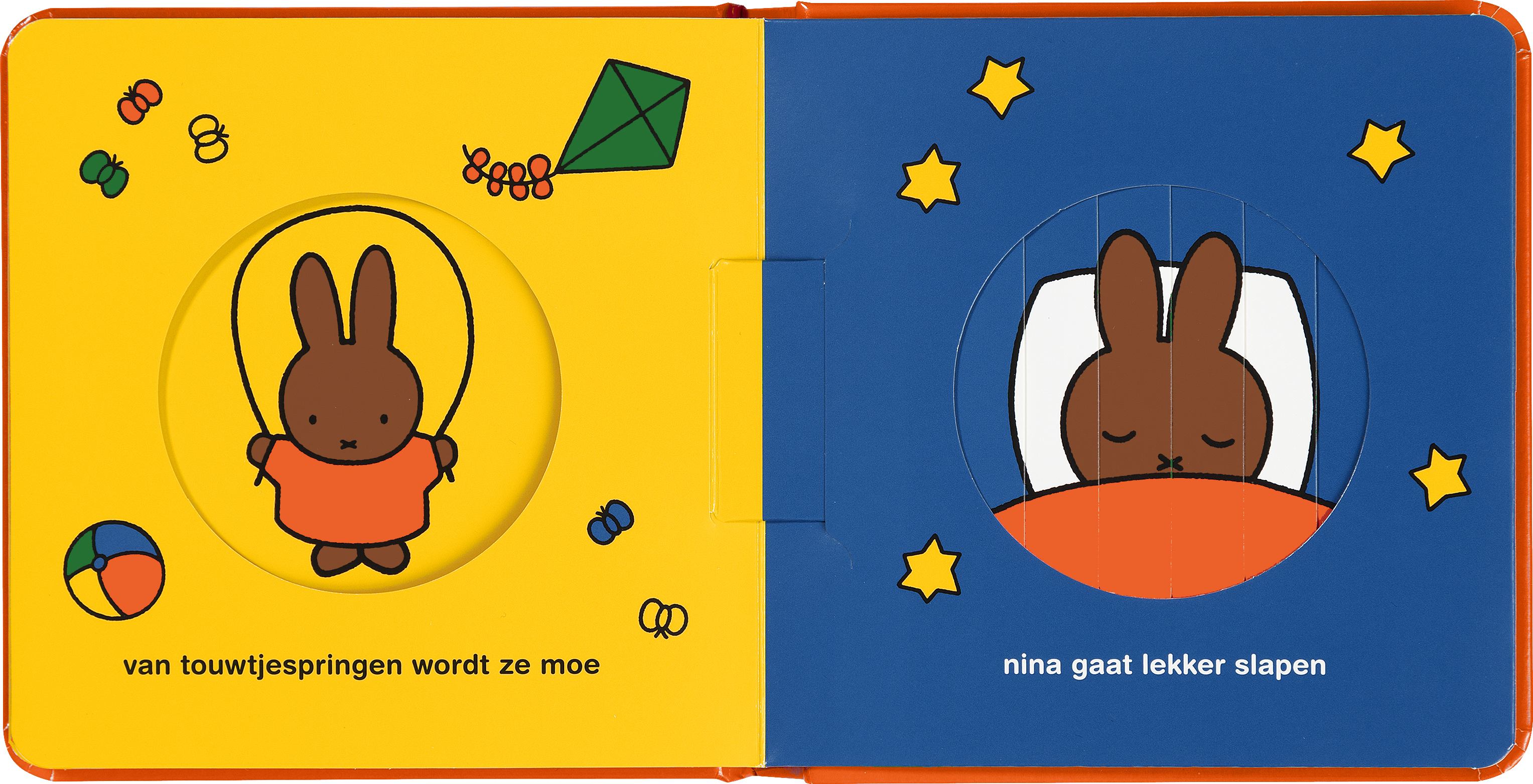 Nijntje en haar vriendjes zijn moe geworden van al hun avonturen. Als je de pagina’s van het nieuwe nijntje vensterboek, oogjes open oogjes dicht omslaat, zie je dat de ogen van de vriendjes van open naar dicht gaan. Welterusten!